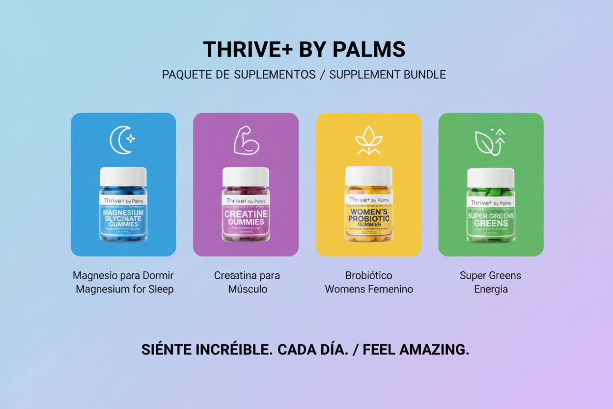 Solución completa de bienestar con nuestro Bundle Thrive+ by Palms. 4 suplementos premium en gomitas para tu salud integral.
